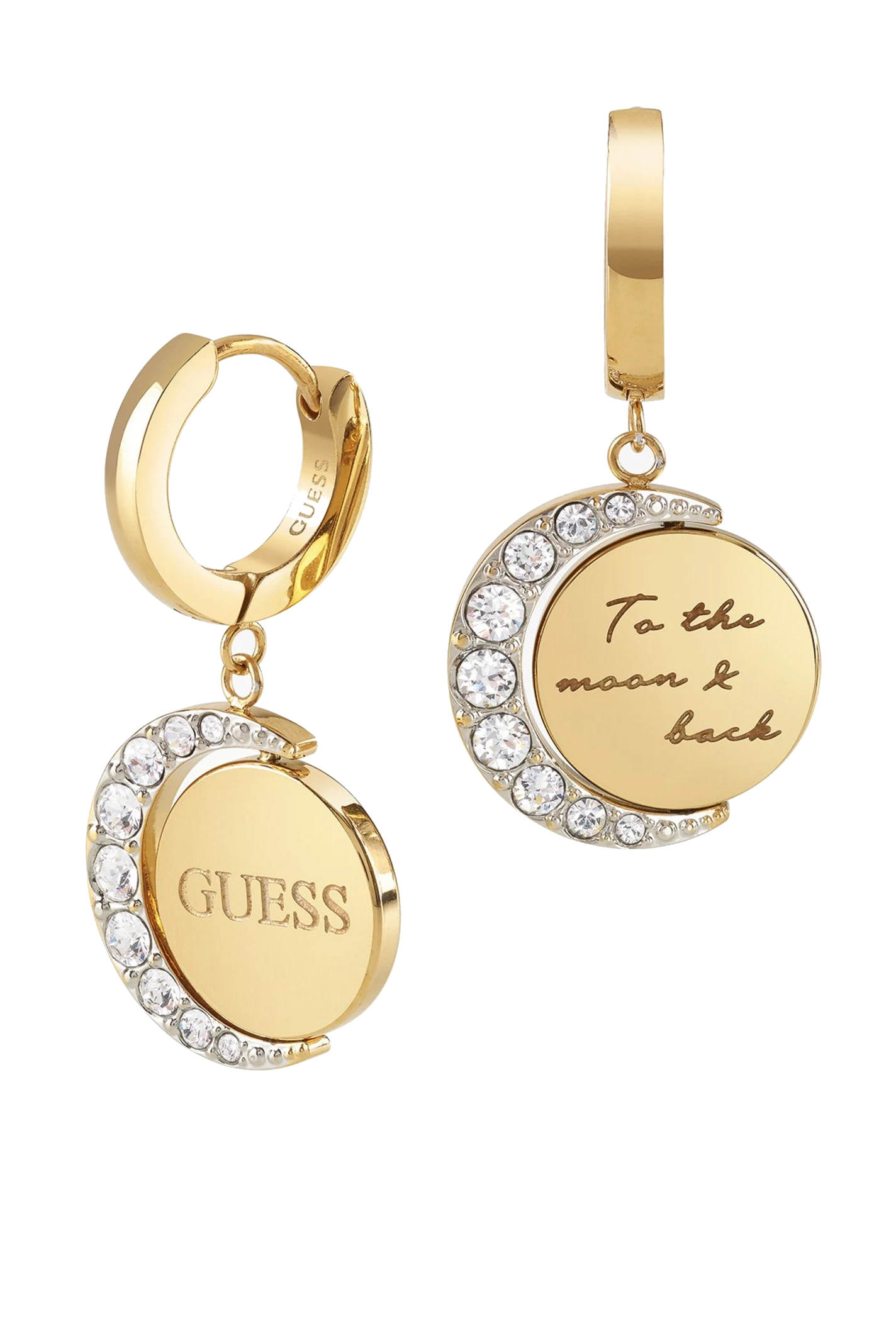 Guess Kruhové pozlacené náušnice s přívěsky Moon Phases JUBE01192JWYG